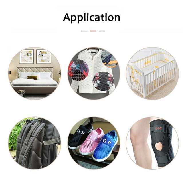 Balances softness and support, applies to shoes, mattresses, bags, plus sports gear, outdoor products, car interiors. Customizable mesh, weight, color for customer needs, wide application & personalized design.